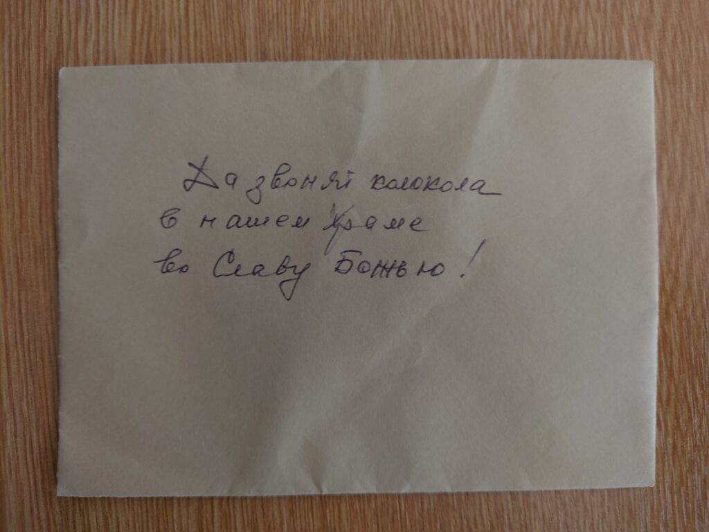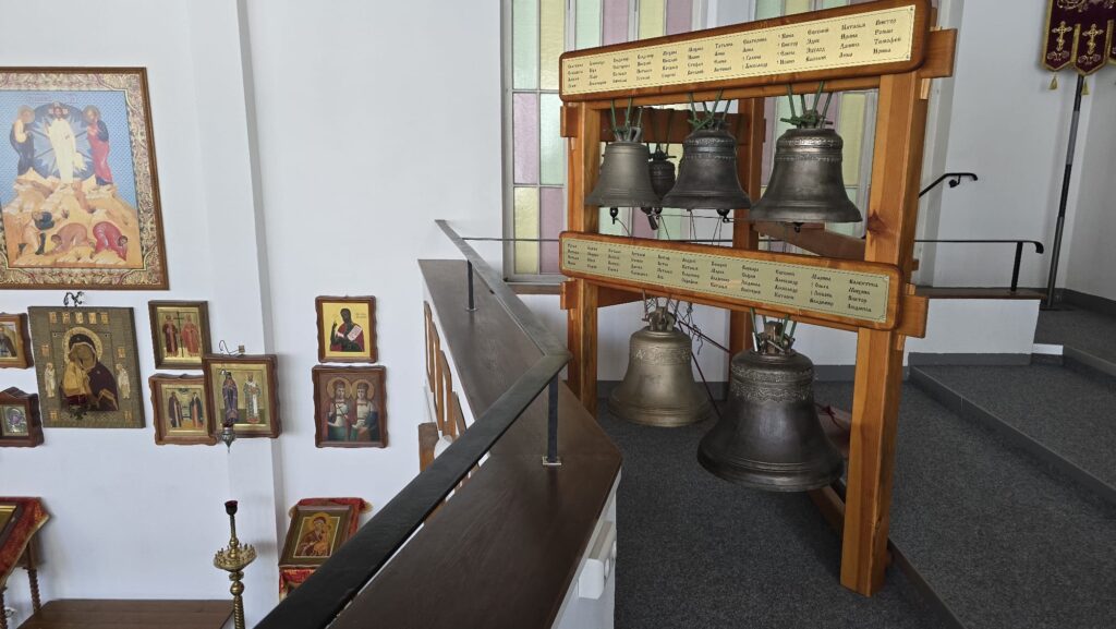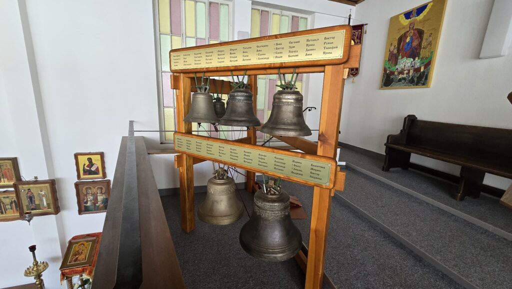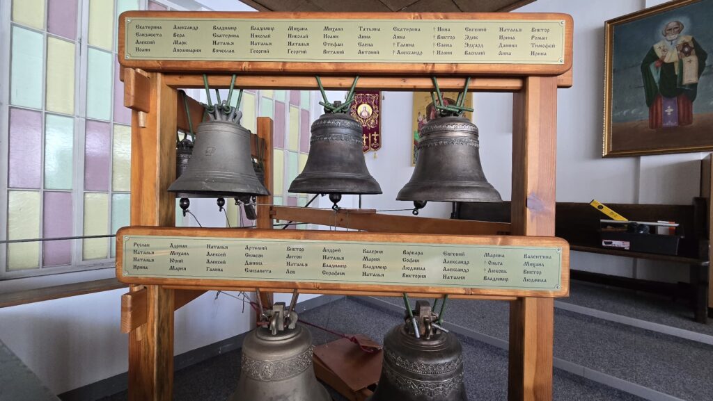 В кратчайшие сроки прихожанами была собрана необходимая сумма и в 2023 году приобретена звонница. Первоначально имена всех жертвователей планировалось выгравировать на колоколах. И кто-то к пожертвованию прикладывал записки с именами, но были и такие жертвователи, которые просто передавали деньги не называя себя, а трогательно писали на конверте «Да звонят колокола в нашем храме во славу Божию». А затем выяснилось, что гравировка имен жертвователей непосредственно на колоколах – дело технически сложно осуществимое, поэтому решили поместить таблички с именами благотворителей на деревянной раме для подвешивания колоколов, где они и будут находиться постоянно. Сегодня, 10 мая 2025 года, с помощью Божией, мы завершили монтировку этой конструкции.