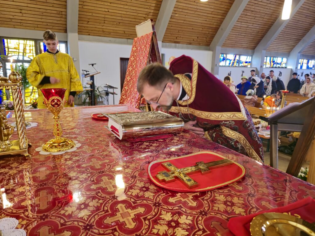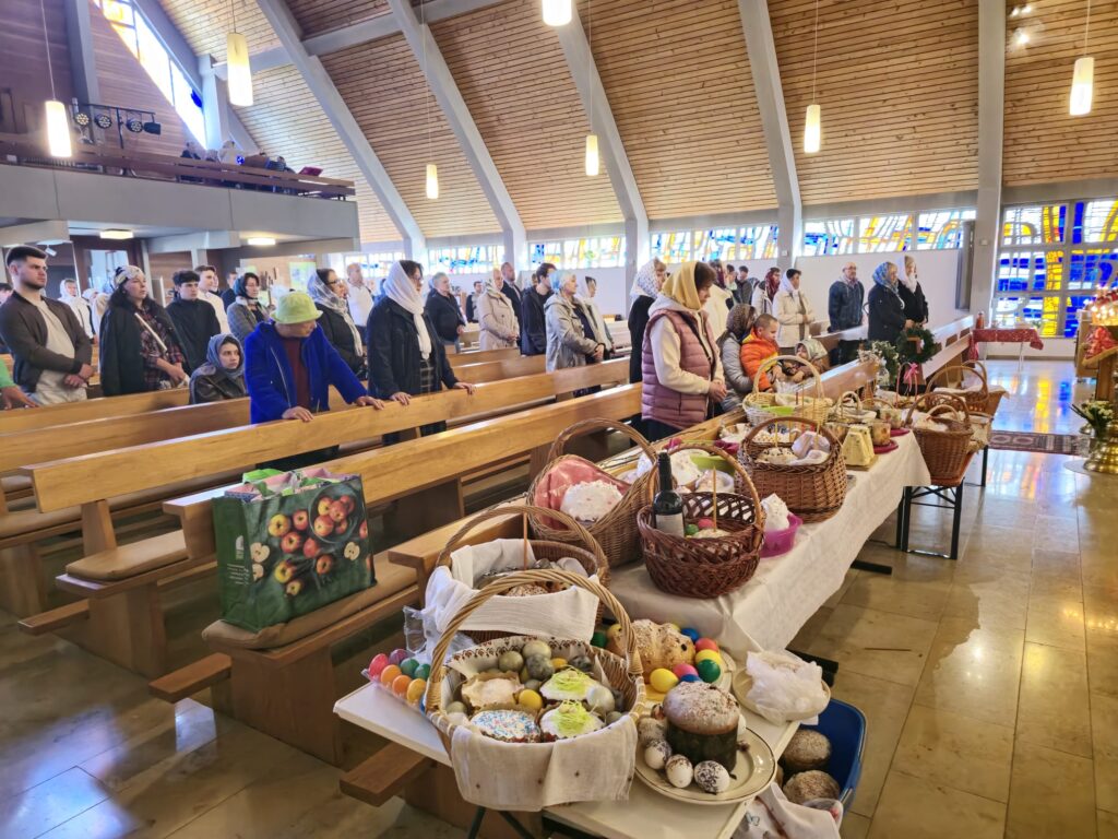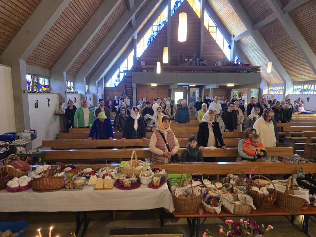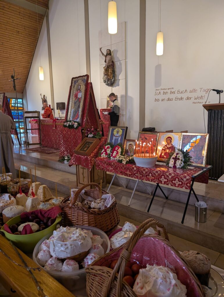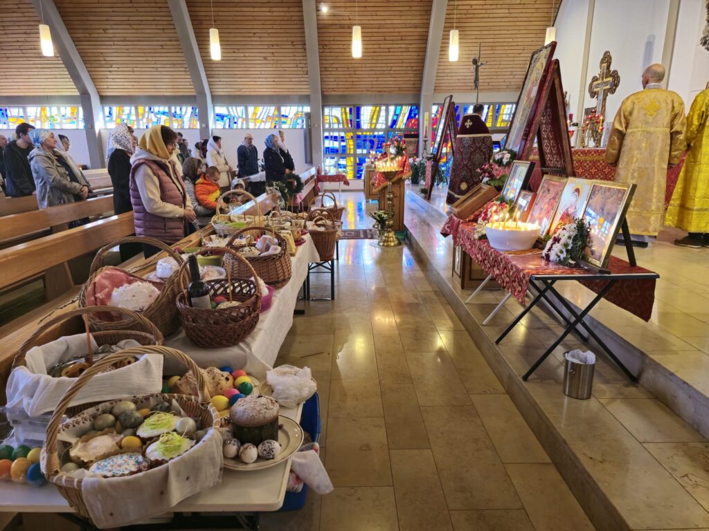 По заамвонной молитве о. Валентин зачитал пасхальное поздравление игумена Максима (Шмидт), настоятеля Сретенского прихода, а затем освятил пасхальные кушанья. Общая трапеза и общение завершили пасхальные торжества в приходе г. Алена.