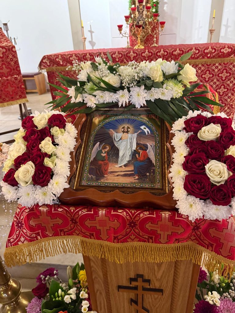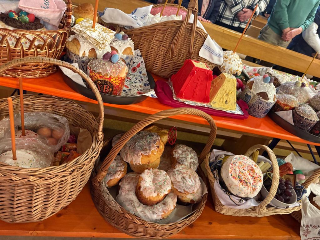 По окончании богослужения о. Валентин поздравил прихожан со Светлым Христовым Воскресением, а затем духовенство освятили пасхальные яства – куличи, творожные паски и крашеные яйца.