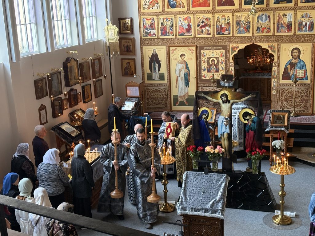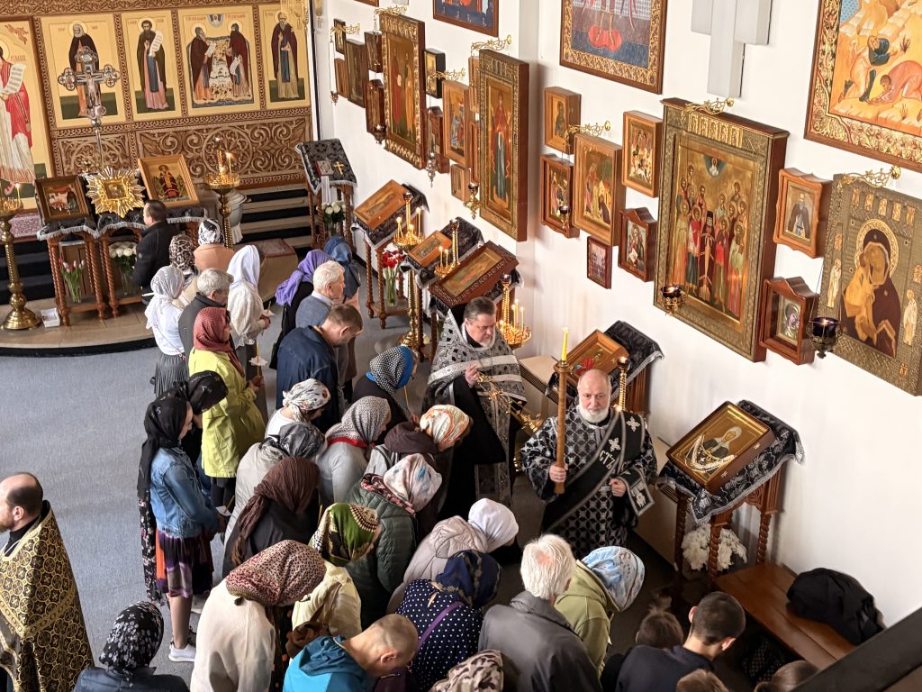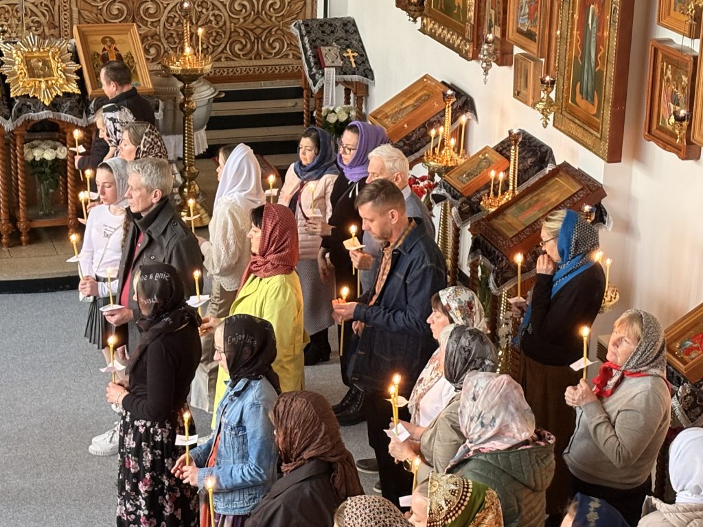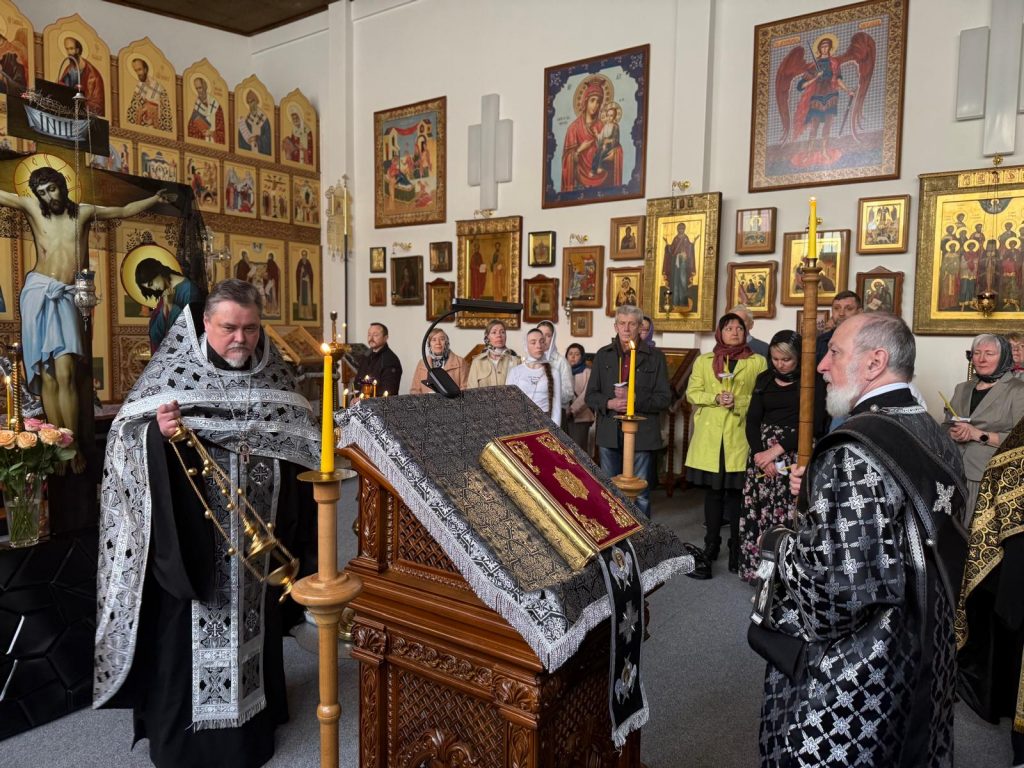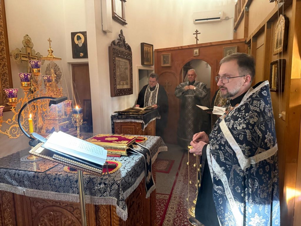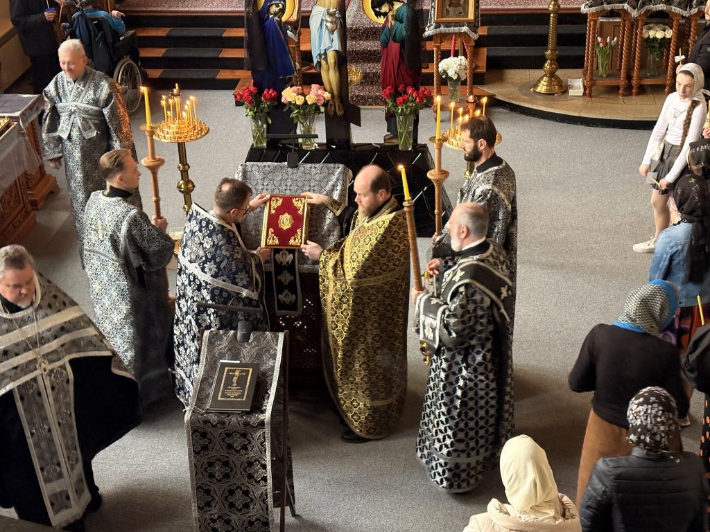 Богослужение возглавил настоятель храма игумен Максим (Шмидт) в сослужении протоиерея Григория Крочака, иерея Валентина Усачёва и диакона Сергия Гофсеца. За литургией пел мужской хор под руководством протодиакона Антония Смолина.