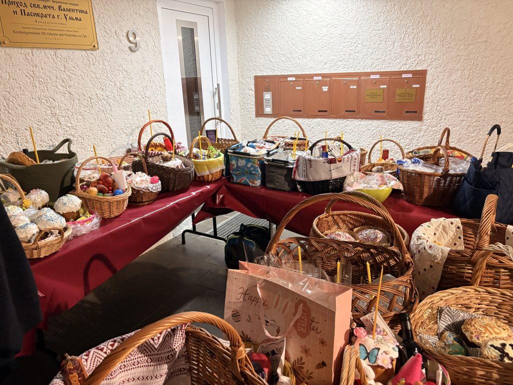 В ночь Светлого Христова Воскресения, с 11 на 12 апреля с. г., в храме иконы Божией Матери «Знамение» Курская-Коренная прихода мчч. Валентина и Пасикрата г. Ульма прошли пасхальные богослужения – Полунощница с каноном Великой Субботы, предваряемая чтением Деяний Апостолов, крестный ход, Пасхальная заутреня и Божественная литургия свт. Иоанна Златоуста.