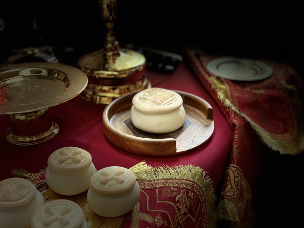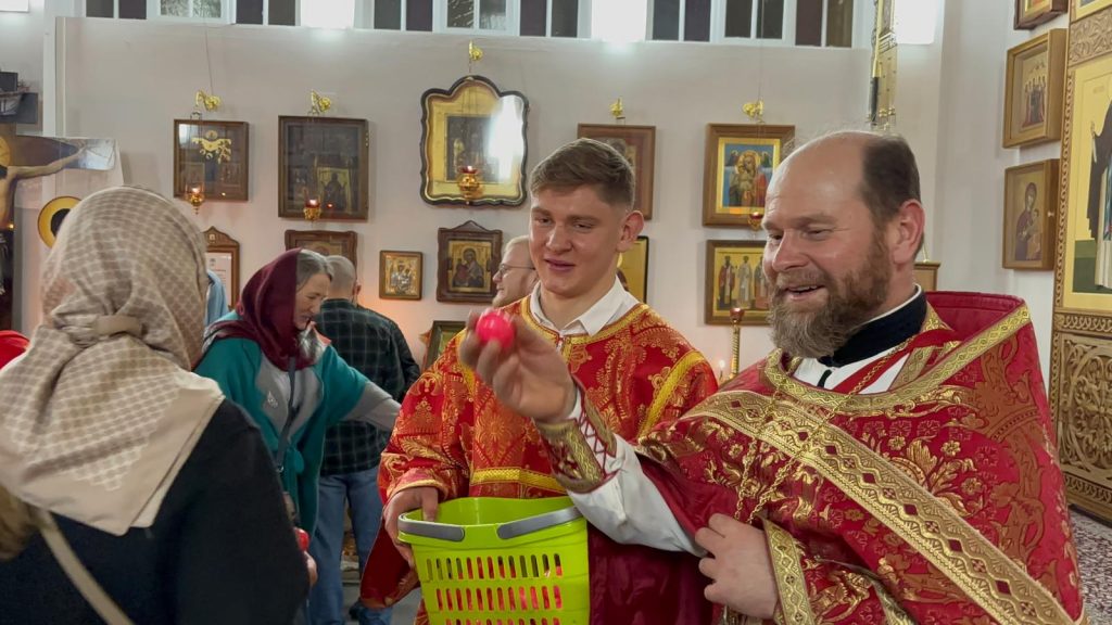 После богослужения отец Максим поздравил всех присутствующих в храме с праздником Светлого Христова Воскресения и призвал нести другим пасхальную радость. После чего также освятил пасхальные яства – куличи, творожные пасхи, крашеные яйца.