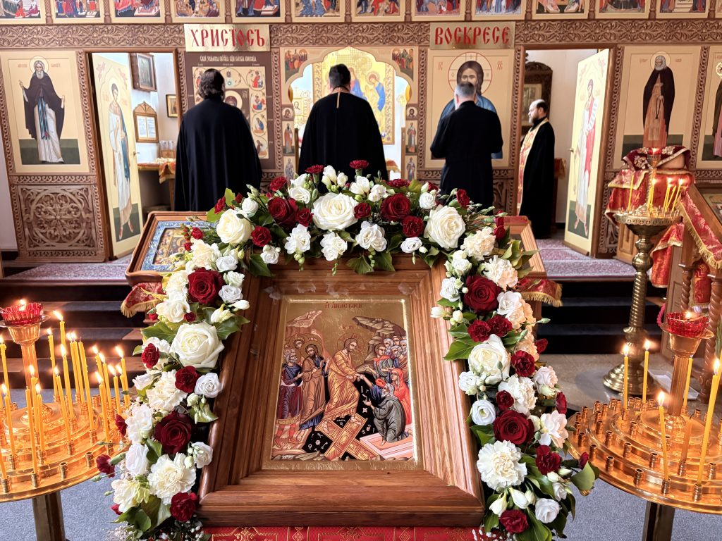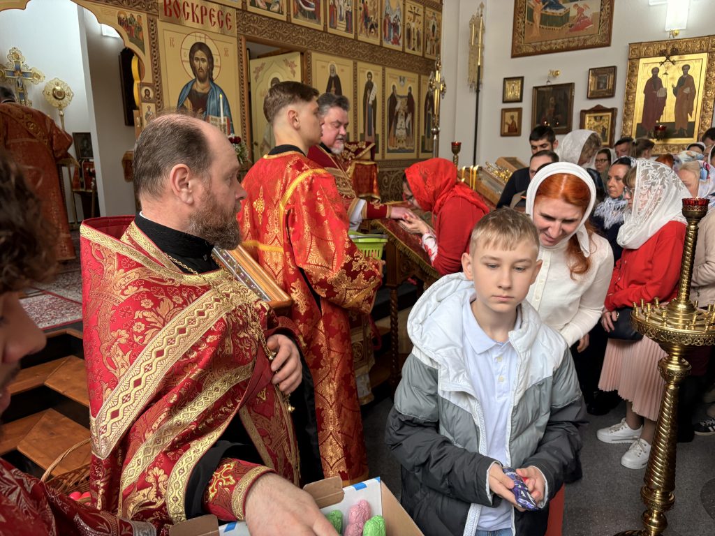 Праздничную Божественную литургию, по благословению настоятеля, возглавил протоиерей Даниил Крочак. По заамвонной молитве игумен Максим освятил артос, а по окончании праздничного богослужения огласил Пасхальное послание Святейшего Патриарха Московского и всея Руси Кирилла архипастырям, пастырям, диаконам, монашествующим и всем верным чадам Русской Православной Церкви. Затем прихожане поздравили настоятеля храма со Светлым Христовым Воскресением. Он же, в свою очередь, поздравляя прихожан, подарил каждому пасхальное яйцо.