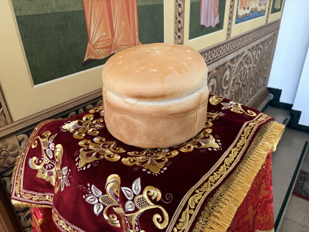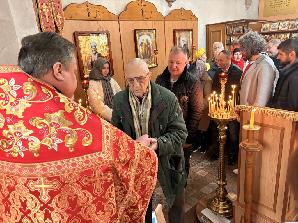 Затем о. Максим поздравил присутствующих с Пасхой Христовой, а также освятил пасхальную снедь прихожан.