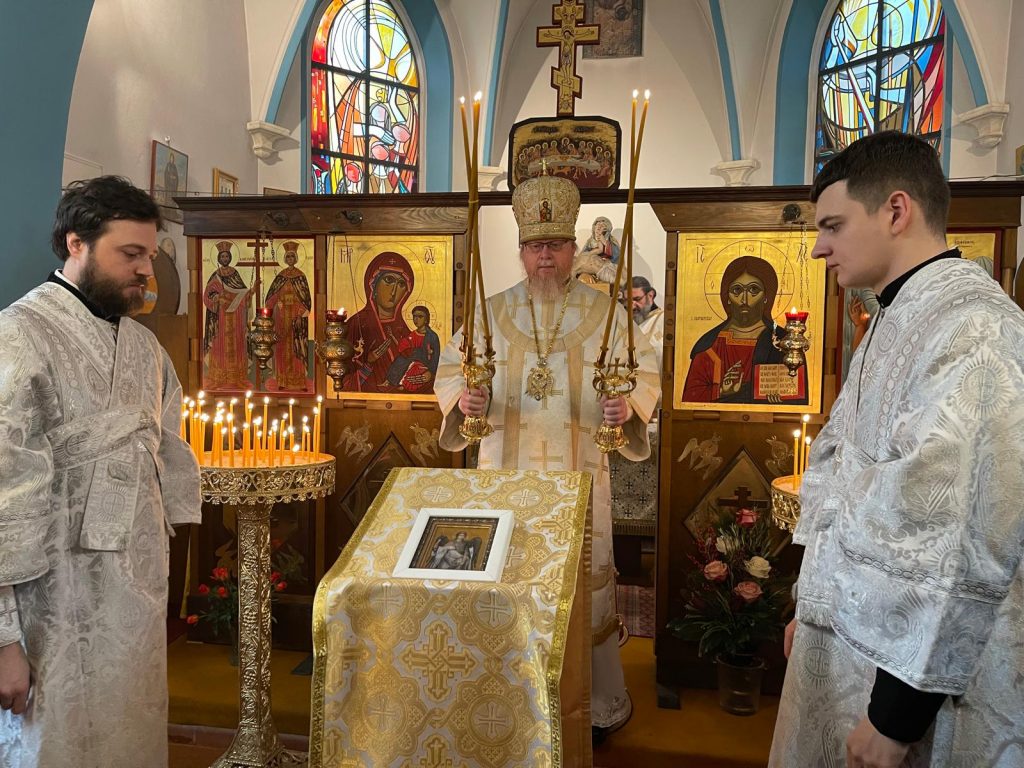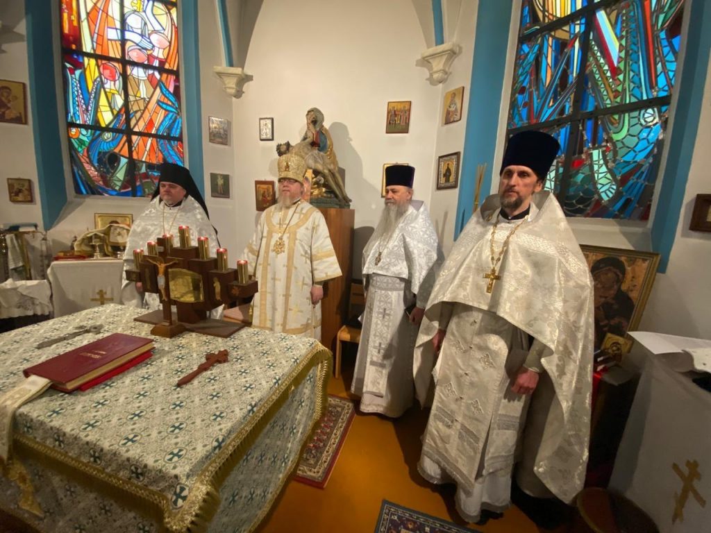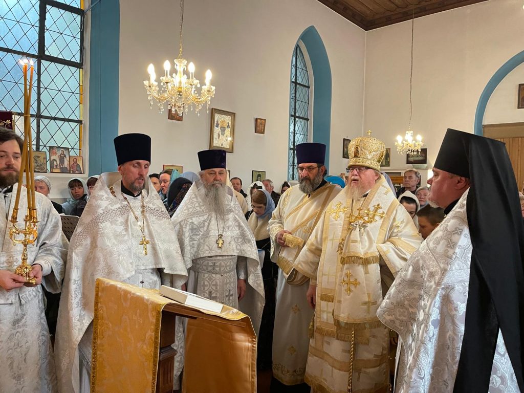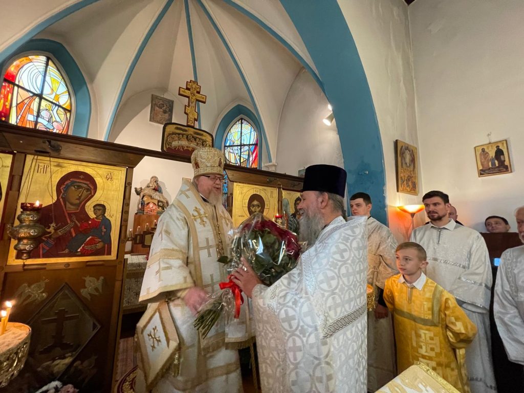 Его Высокопреосвященству сослужили: и.о. благочинного Южного округа протоиерей Михаил Дронов, игумен Максим (Шмидт), настоятель прихода иерей Константин Шмидт, протодиакон Арчил Чхиквадзе и диакон Ростислав Устименко.